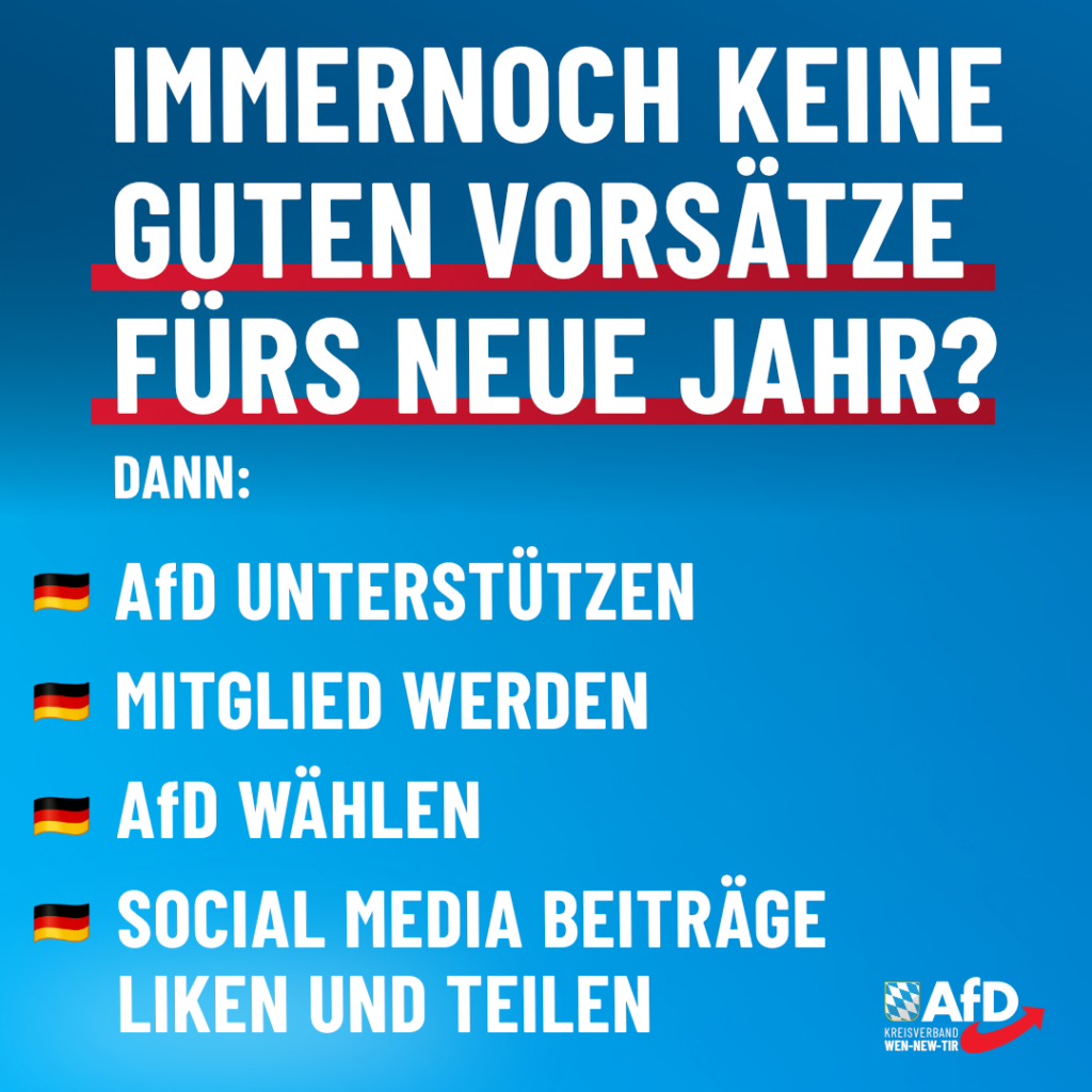 🤔 Ihr habt noch keine guten Vorsätze fürs neue Jahr? 🇩🇪 Wie wärs mal mit Deutschland retten? 📘 AfD unterstützen 💙 Mitglied werden 🗳 AfD wählen 👍🏻 Social media Beiträge […]