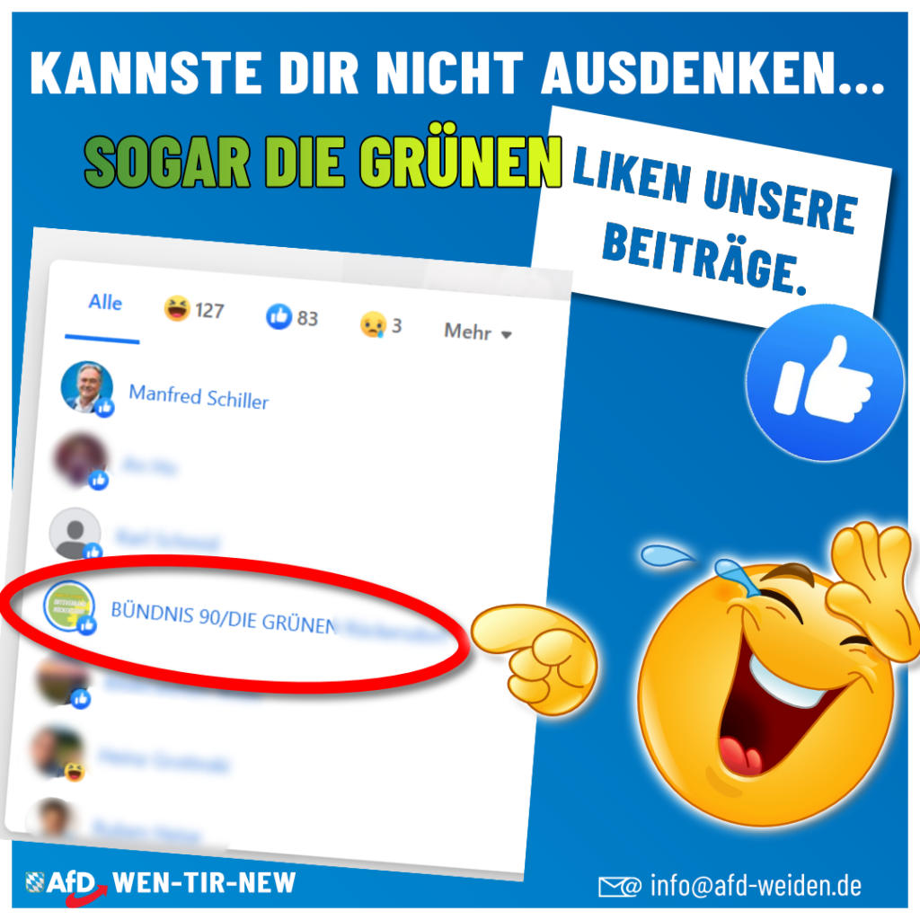 Sachen gibt´s… Mittlerweile liken so gar die Grünen unsere Beiträge. 😂 Euer AfD Kreisverband Weiden, Oberpfalz 🇩🇪TEILEN🇩🇪LIKEN🇩🇪ABONNIEREN🇩🇪 Folgt uns auch auf: 📱 https://t.me/afdweiden 📱 https://www.facebook.com/afd.weiden/ 📱 https://whatsapp.com/channel/0029VaXcPaR8KMqmI82DFy2c 📱 https://twitter.com/AfD_KV_Weiden 📱 […]