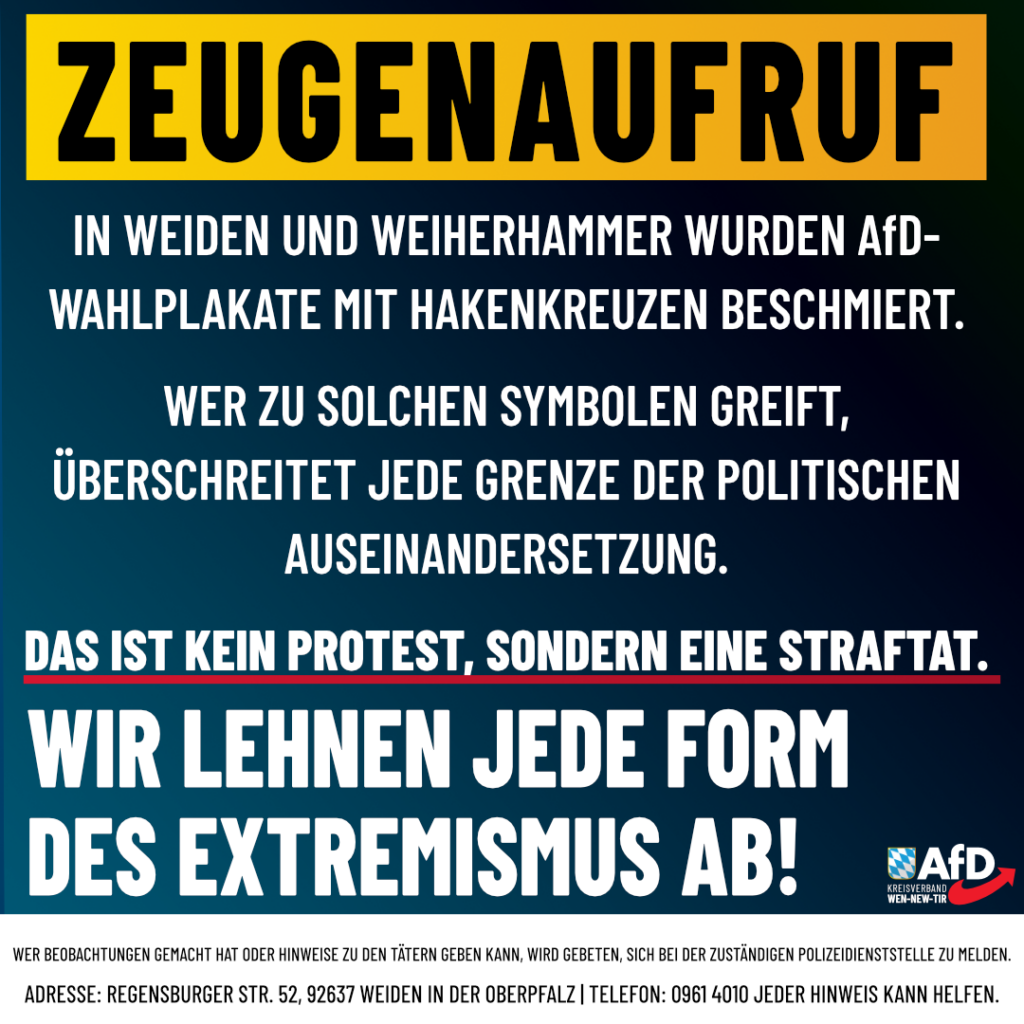 In Weiden und Weiherhammer wurden AfD-Wahlplakate mit Hakenkreuzen beschmiert. Der Einsatz solcher Symbole überschreitet jede Grenze der politischen Auseinandersetzung. Das ist kein Protest, sondern eine Straftat. Wer Beobachtungen gemacht hat […]