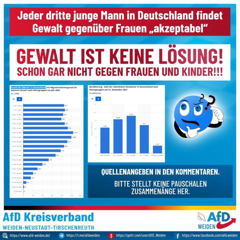 Artikel: https://www.welt.de/politik/deutschland/article245799552/Gewalt-Jeder-dritte-junge-Mann-findet-Gewalt-gegenueber-Frauen-akzeptabel.html Bevölkerung – Zahl der männlichen Einwohner in Deutschland nach Altersgruppen am 31. Dezember 2021 https://de.statista.com/statistik/daten/studie/1112607/umfrage/maennliche-bevoelkerung-in-deutschland-nach-altersgruppen/ Anzahl der Männer¹ in Deutschland mit Migrationshintergrund (im weiteren Sinne)² nach Altersgruppen im […]