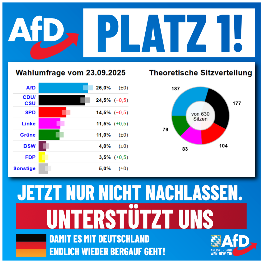 💥 AfD auf Platz 1! 💥 Wir haben es geschafft: Zum ersten Mal liegt die AfD mit 26 % in einer bundesweiten Umfrage ganz vorne – noch vor der CDU/CSU! […]