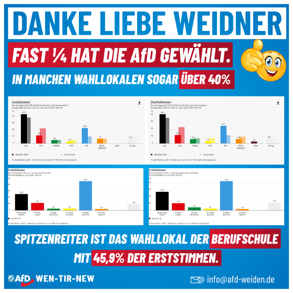 Fast ein Viertel des Wahlkreises Weiden hat die AfD gewählt. Absolute Spitzenreiter bei der Urnenwahl waren die Wahllokale Berufsschule mit 45,9 % und Hammerwegschule mit 42,5 % der Wählerstimmen. In […]