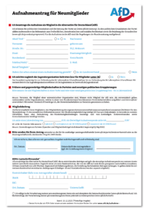 Um die Aufnahme in die AfD beantragen zu können, dürfen Sie keiner konkurrierenden Partei, keiner rechtsextremen, linksextremen oder islamistischen Organisation angehören und müssen sich vorbehaltlos zur freiheitlich-demokratischen Grundordnung der Bundesrepublik Deutschland bekennen.