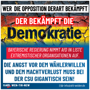 Die Bayerische Staatsregierung hat die AfD offiziell als „extremistische Organisation“ eingestuft. Ein Schritt, der nicht nur durchsichtig, sondern auch gefährlich ist. Man will die AfD somit auf die gleiche Stufe stellen wie Al-Qaida oder den Islamischen Staat.