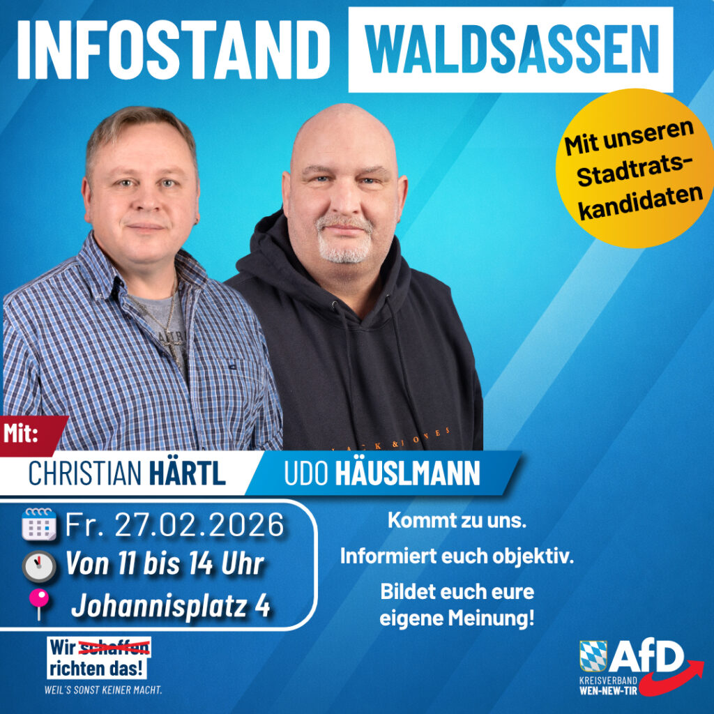 ℹ️ AfD Infostand in Waldsassen 🗓 am Freitag, 27.02.2026 🕚 von 11-14 Uhr 📍 Waldsassen (Johannisplatz 4) U.a. mit unseren Stadtratskandidaten: Christian Härtl und Udo Häuslmann. Kommt zu uns und […]