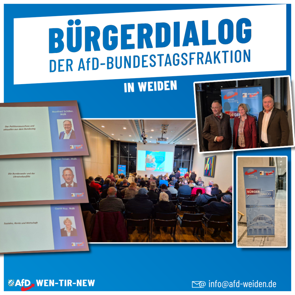 Gestern in Weiden: Bürgerdialog der AfD-Bundestagsfraktion In der Max-Reger-Halle fand gestern ein spannender Bürgerdialog der AfD-Bundestagsfraktion statt. Die Besucher bekamen Einblicke ins politische Berlin, den Parlamentsbetrieb und die Erfahrungen mit […]