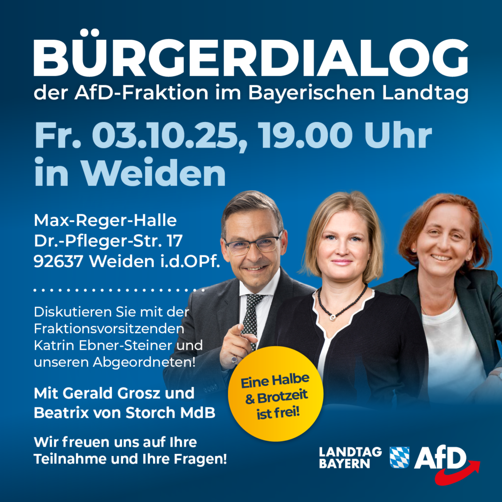Die AfD Landtagsfraktion lädt ein. 👉 Diskutieren Sie mit der Fraktionsvorsitzenden Katrin Ebner-Steiner und unserem Abgeordneten Roland Magerl. Stargäste: 👉 Gerald Grosz 👉 Beatrix von Storch (MdB) Wann: Freitag, 03.10.25 […]