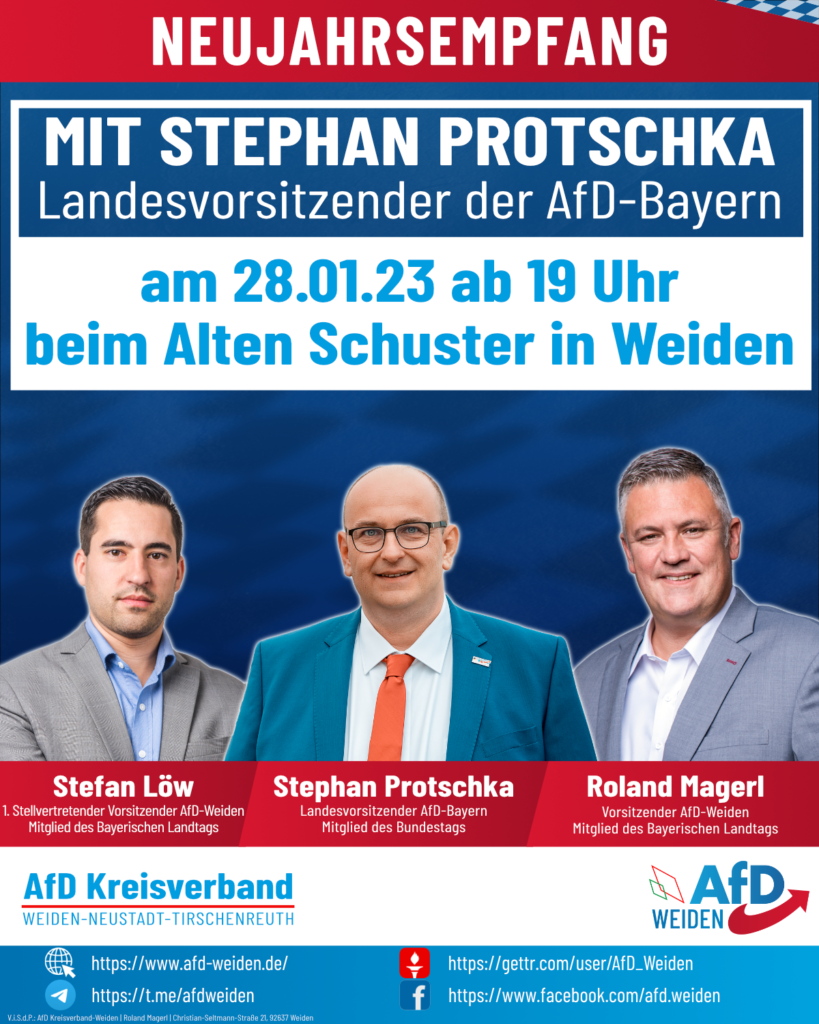 Der Kreisverband Weiden-Neustadt-Tirschenreuth der Alternative für Deutschland lädt für den 28.01.2023 um 19 Uhr seine Mitglieder und Interessenten in das Schmankerlwirtshaus „Zum Alten Schuster„ zu einem Neujahrsempfang ein. Dem Team […]