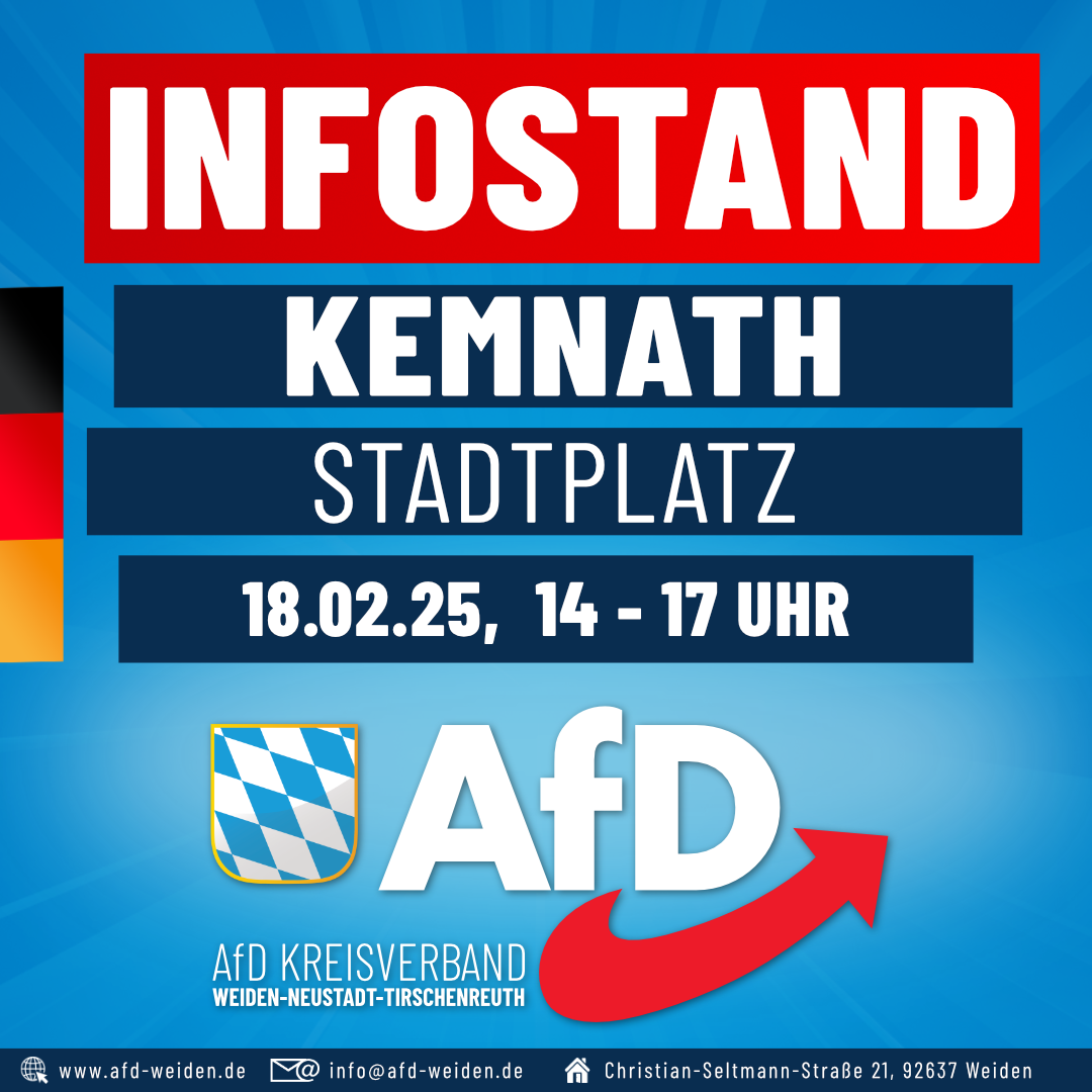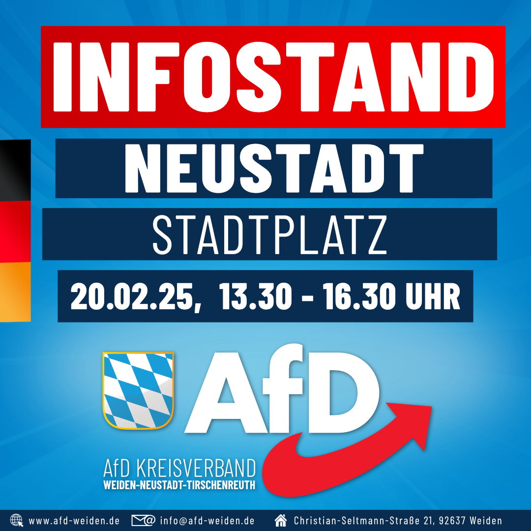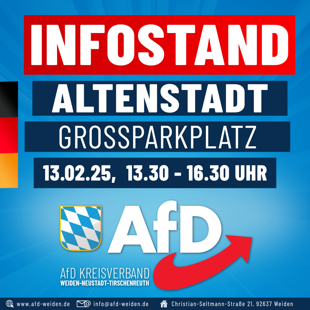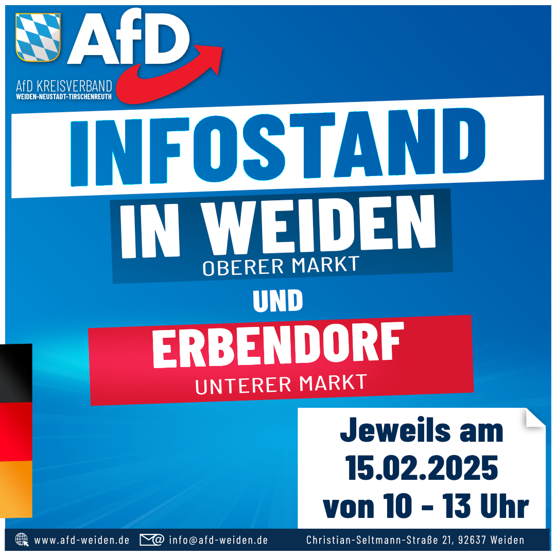 ℹ️ Diesen Samstag, 22.02.2025 bieten wir euch zwei Infostände an. Einen Infostand in Weiden (Oberer Markt) von 10-13 Uhr. Und einen Infostand in Eslarn (Marktplatz) von 10-12 Uhr Kommt zu uns und informiert euch aus erster Hand. Euer AfD Kreisverband Weiden, Oberpfalz |