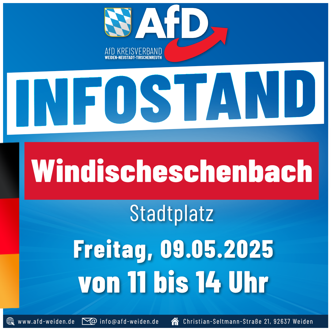 🔥 Kanzlerwahldesaster 2025: Friedrich Merz – Kanzler der zweiten Wahl? 🗓 Donnerstag, 08.05.2025 📍 AfD-Büro Weiden | Christian-Seltmann-Straße 21 🕕 Beginn: 18:00 Uhr 🗣 Offene Diskussion – unverbindlich, für alle Bürger. Während Berlin im Machtchaos versinkt und sich Friedrich Merz durch die Hintertür ins Kanzleramt schiebt, laden wir zur offenen Diskussion mit unserem Bundestagsabgeordneten Manfred […]