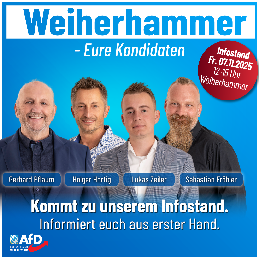 Weiherhammer, wir sind vor Ort! Am Freitag, den 07. November 2025, stehen wir von 12 bis 15 Uhr beim AfD-Infostand in Weiherhammer. Lernt unsere Kandidaten Gerhard Pflaum, Holger Hortig, Lukas Zeiler und Sebastian Fröhler persönlich kennen. 💬 Wir hören zu, sprechen Klartext und beantworten eure Fragen direkt – ohne Filter, ohne Schönfärberei. Ob kommunale Themen, […] |