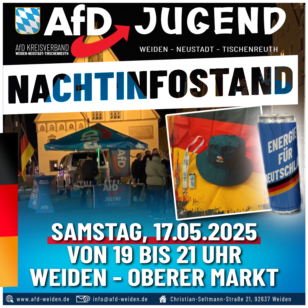 🌘 AfD-Nachtinfostand in Weiden 📆 17.05.2025 | 🕖 19–21 Uhr | 📍 Oberer Markt Wir sind immer für euch da. Nicht nur kurz vor Wahlen. Die anderen Parteien schlafen – wir sind wach. Lerne die Alternative kennen. Wir stehen dir Rede und Antwort. Deutschland braucht mehr als stille Zustimmung. Du denkst wie wir? Dann wird’s […]