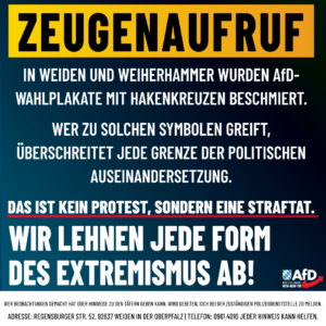 In Weiden und Weiherhammer wurden AfD-Wahlplakate mit Hakenkreuzen beschmiert.